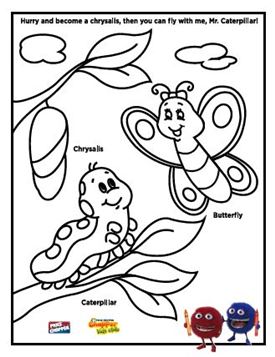 Also, don't forget to print out our April activities for kids to do at home! This month features a coloring sheet that teaches the three life stages of a butterfly and another butterfly snack using a piece of candy.