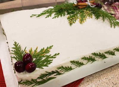 Evergreen bouquets are also available in the floral department at Price Chopper. Or you can simply snip a few sprigs off of your pine tree or evergreen bush. Arrange the sprigs to create somewhat of a frame around the edge of the cake. Add accents with cinnamon sticks and cranberries. TIP: Add a tiny bit of frosting to the bottom of the cranberries to help them stick where you want them. TIP: Add a tiny bit of frosting to bottom of each berry to help it stay in place. TIP: Use a sifter to create the perfect “snowed upon” look with the powdered sugar.
