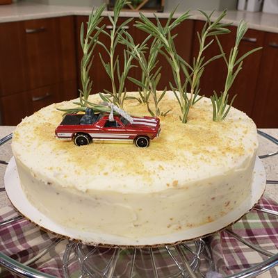We used a carrot cake for this fun scene. First, carefully remove any top decorations and any crumbs from the sides. Smooth icing to create a blank slate. Sprinkle graham cracker crumbs to create a “bed of sawdust”. Trim 4-5 inch sections of rosemary (or pine sprigs). Place sprigs one by one vertically into the top of the cake. Arrange to look like a Christmas tree farm. Tie one last rosemary sprig to the top of a Hot Wheels car, and place the car in front of your Christmas tree farm. TIP: The more vintage the Hot Wheels car, the better.