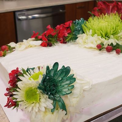 Pick up a winter bouquet from Price Chopper’s floral department when you pick up the cake. One by one, trim the stems of the flowers you want to use down to approximately an inch. Starting with the largest flowers first, place the stems straight down into the cake. Work out from the larger flowers with medium and small flowers - following the edge of the cake. TIP: You can insert the stem into a trimmed piece of straw to minimize the contact the flowers have with the actual cake.