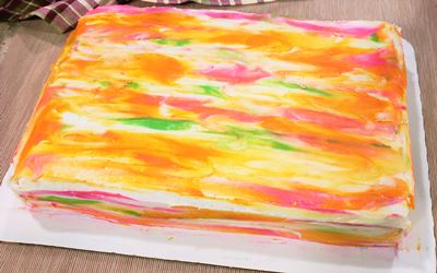 This last method isn’t necessarily specific to the holidays, but we still love it. (And it’s really easy to do.) For this fun design, make sure to select a cake from the shelf that has 2-3 colors of decorative icing on the edges. Again, start by carefully removing all the decorative icing, but make sure to keep the different colors separate. Once you have a clean slate to work with, mix the first color until the icing is a smooth consistency. With your spreader (or butter knife), put small dabs of color all around the cake - like polka dots. Follow with the second and third colors. Once you have multicolored polka dots all over the cake, take the straight edge of the knife and smooth the dabs of color into each other. This does not need to be neat. Continue until the colors are smeared all around the cake. The end result should look like you took a page from Monet’s Waterlilies. TIP: When smoothing colors together, start at one and pull all the way through to the other edge without stopping. This will create the smoothest look.