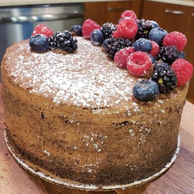 This works best with layered cakes. Carefully remove all extra icing decor. Using a clean, smooth knife continuing removing icing until you have a very thin layer of icing all around. Starting on the edge, place a variety of berries closely together. Continue placing berries, following the edge of the cake until you create a crescent shape with them. Add additional berries on the inside and on top of already placed berries to create height. Top with a small amount of powdered sugar.