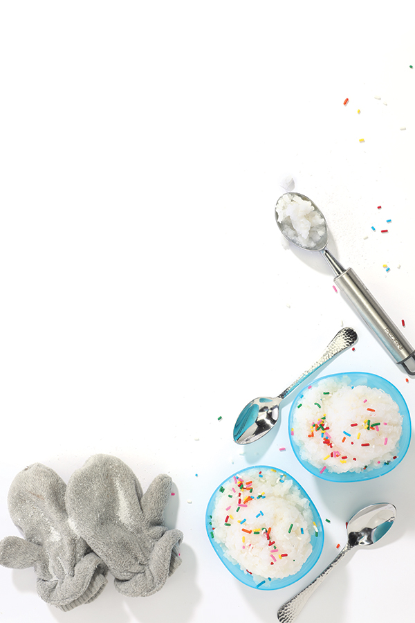 Once you’ve gathered your supplies, add the snow, milk, sugar, and flavoring to a bowl. Stir gently to combine. Add your toppings and you’re done!