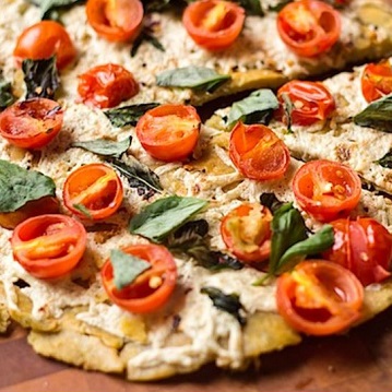 This mostly plant-based pizza is made from chickpea flour (also known as garbanzo beans). Socca is chickpea flatbread and serves as a perfect pizza crust! As a bonus, it is naturally gluten-free and the chickpea flour helps keep a great texture and flavor.