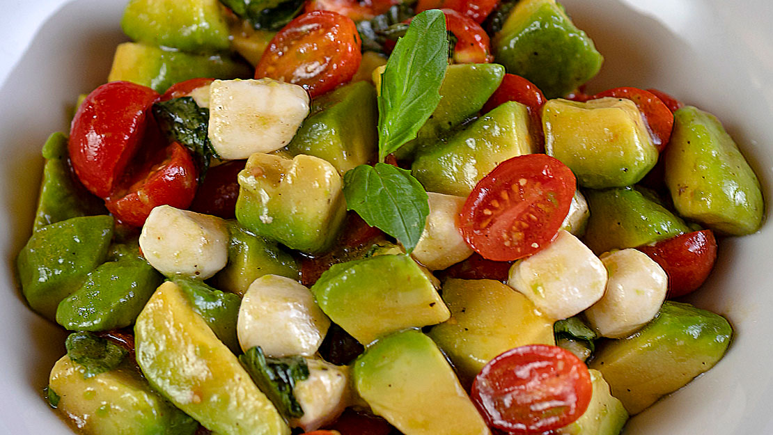 Cherry tomatoes, fresh mozzarella, avocado & basil topped with a light vinaigrette make a wonderful Caprese salad. A perfect side for a no-cook meal.