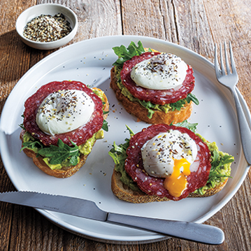 - Toast bread; spread with avocado mixture. Top with arugula, salami and poached eggs; sprinkle with seed mixture.