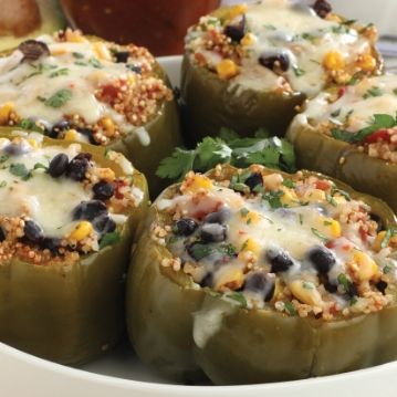 - In a large bowl, combine black beans, corn, tomatoes, quinoa, spices, nutritional yeast (if using) and cheese. Spoon the mixture into each pepper, filling to the top.