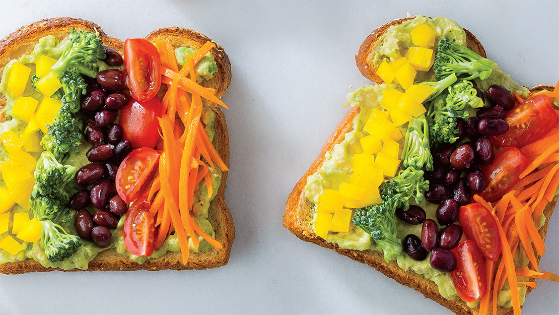 - Toast bread; spread with avocado mixture. Arrange carrots, tomatoes, beans, broccoli, and bell pepper in rows over avocado mixture; drizzle with oil.