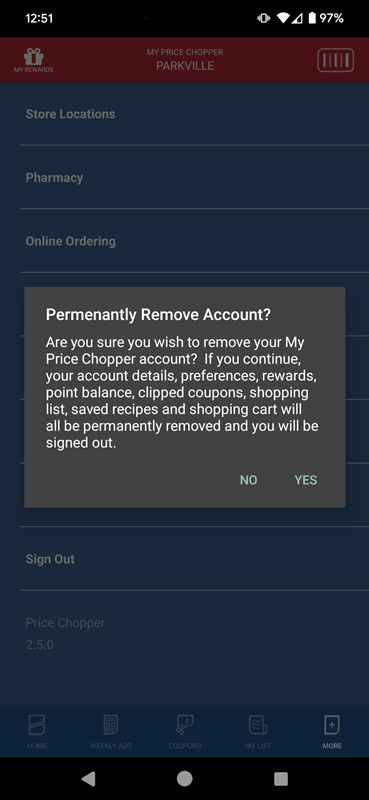 If you tap "No", no action will be taken and your account will not be removed. However, if you tap "Yes", all of your account details, preferences, rewards, point balance, clipped coupons, shopping list, saved recipes and shopping cart will all be permanently removed and you will be signed out of the app. Any previously placed online orders will be retained for the purposes of store reporting, but none of your account's demographic data will remain, so your orders will no longer be identifiable or associated with you in any manner in our systems.