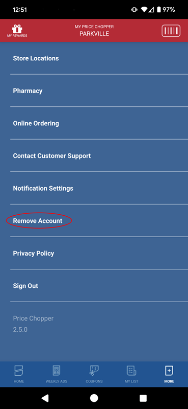 If you need to need to request removal of your Chopper Shopper rewards account, you may now do so via the My Price Chopper Android app.